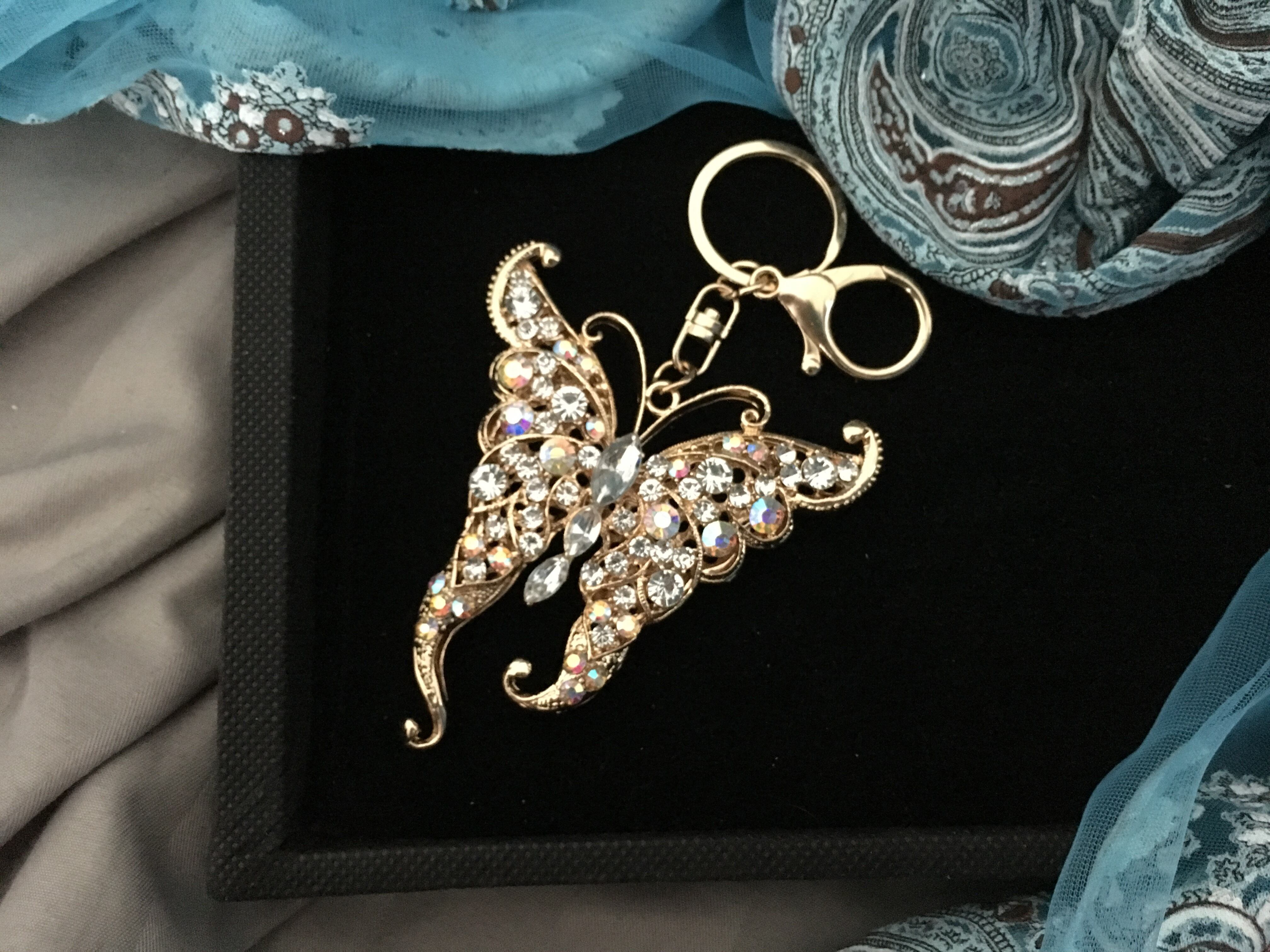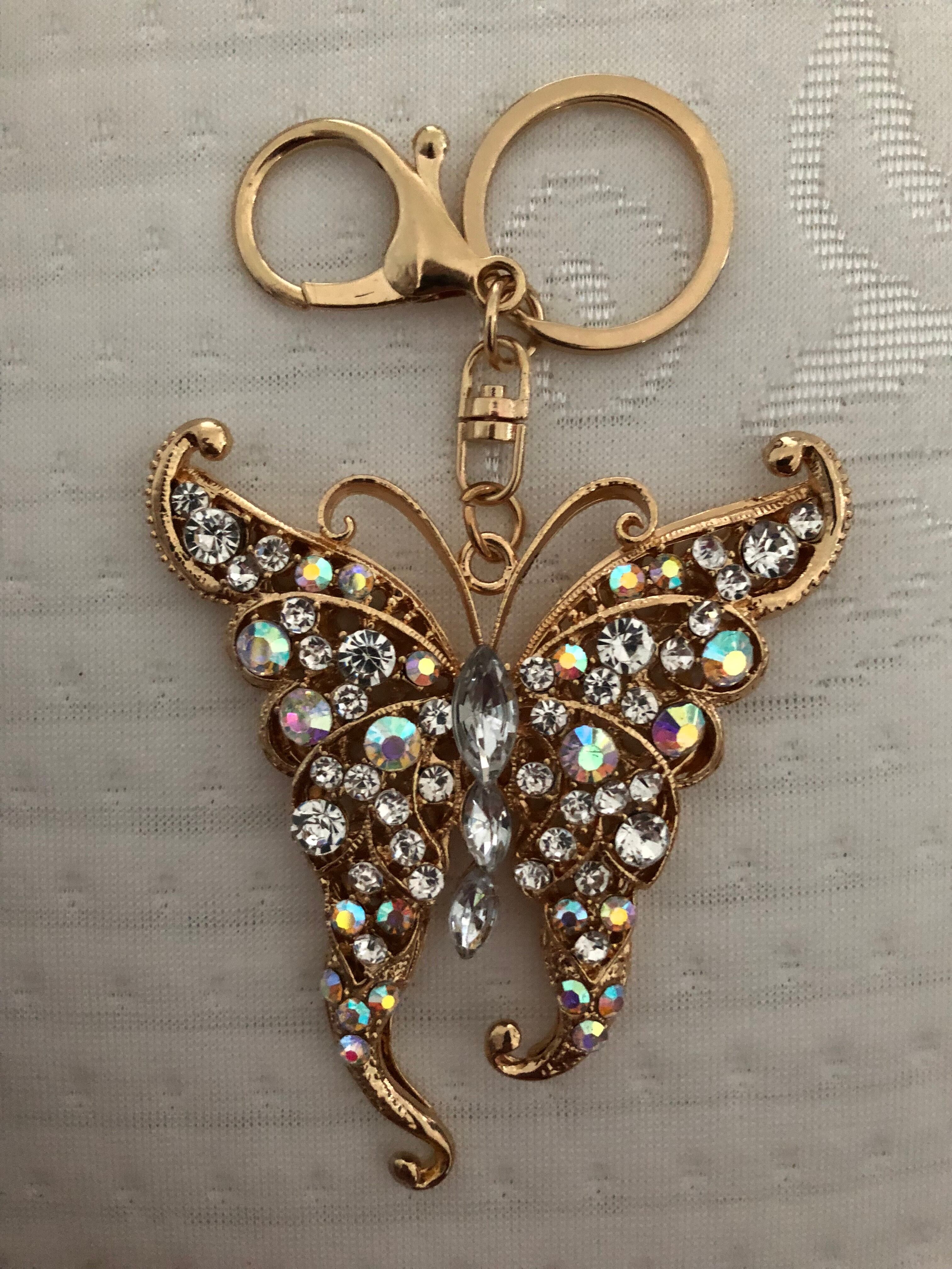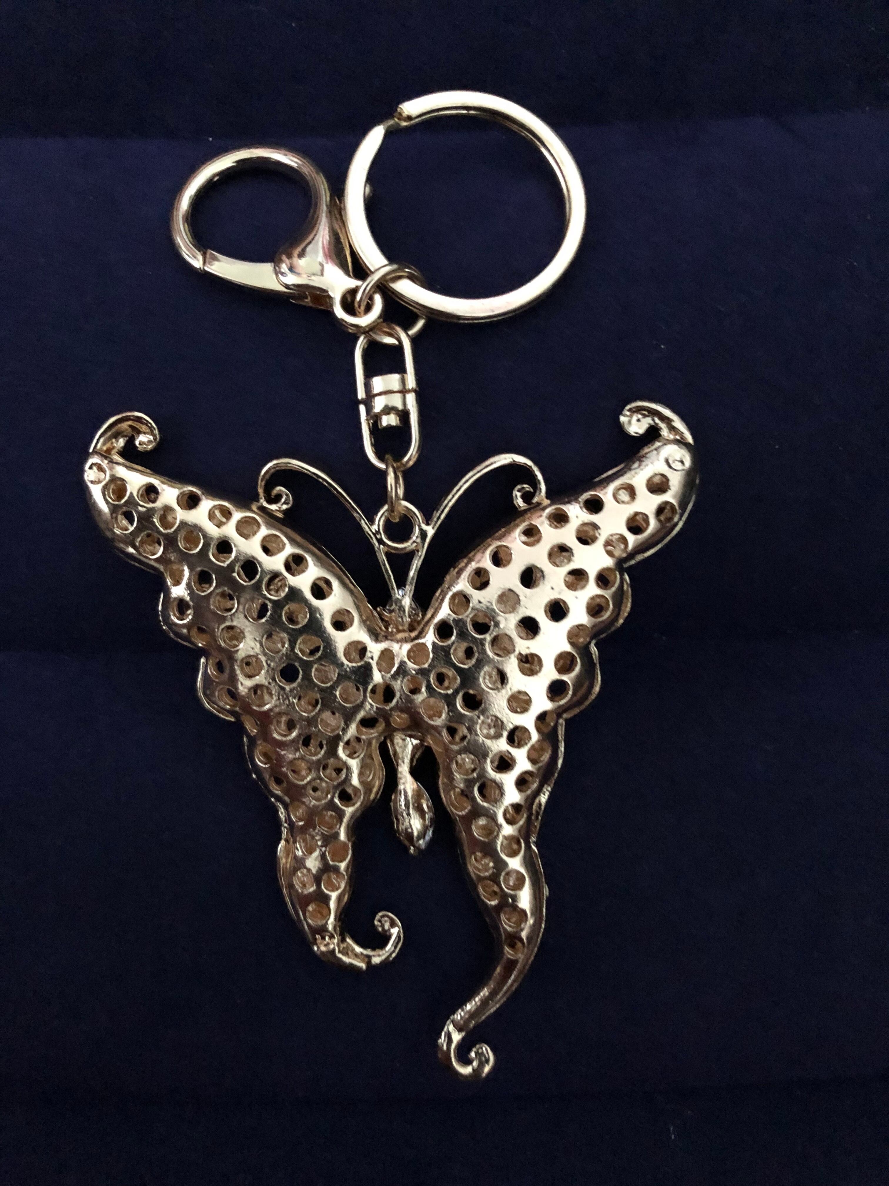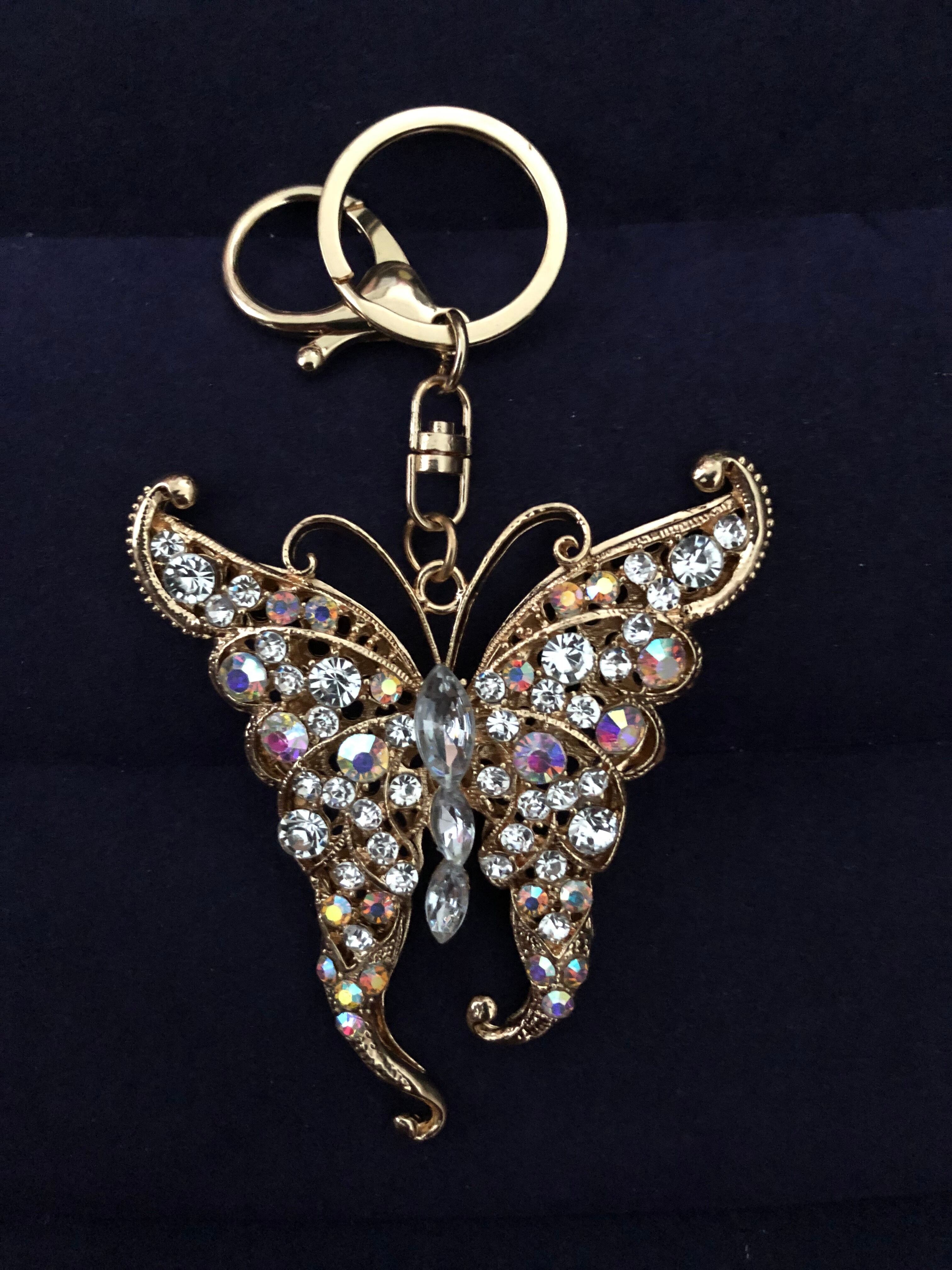 ぎっしり敷き詰められたビジューの蝶のバッグチャームキーホルダー インパクトのある大きいサイズと付属のタッセルが可愛いキーホルダー。キーホルダーとしてもチャームとしてもOK