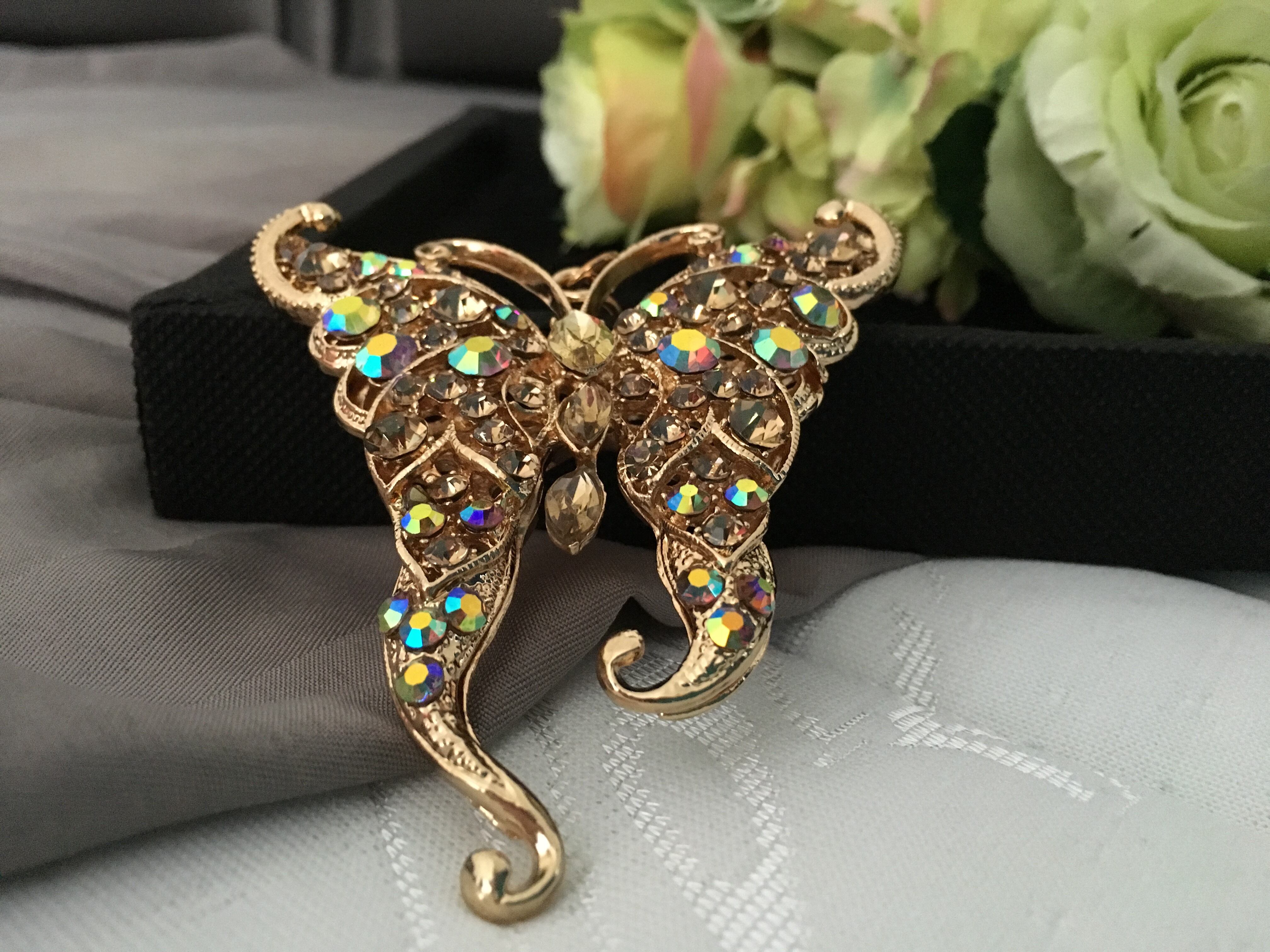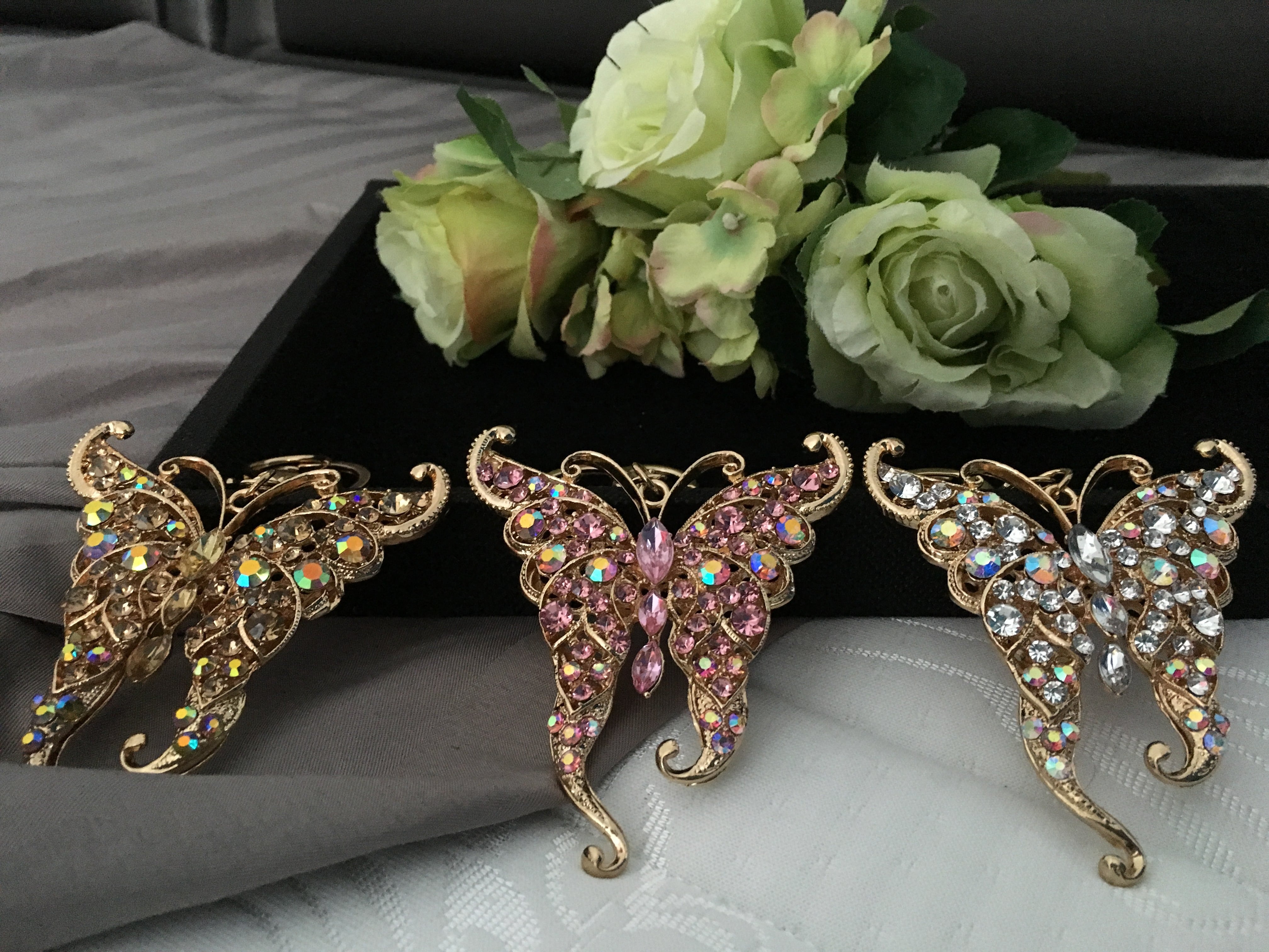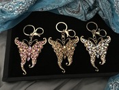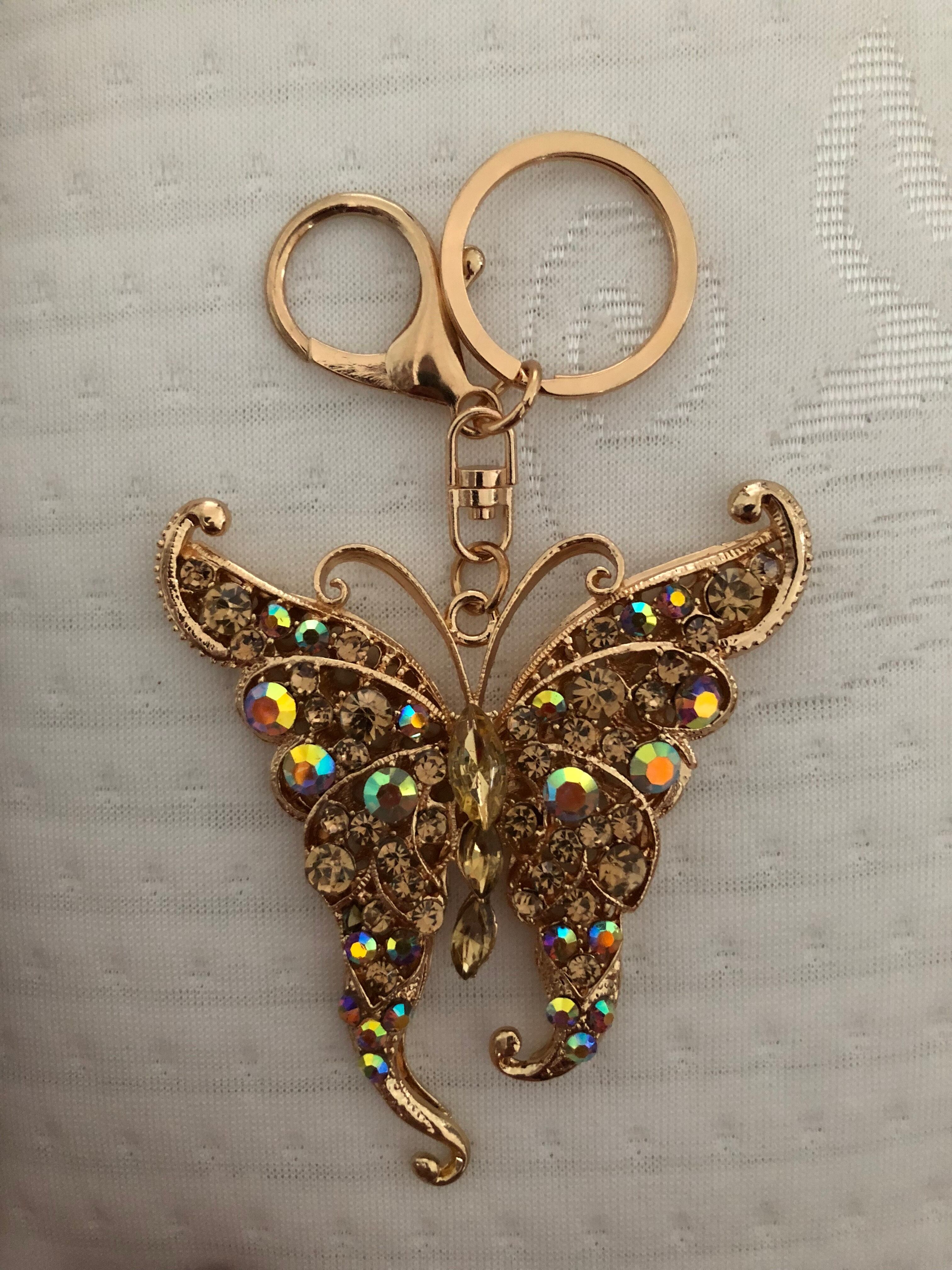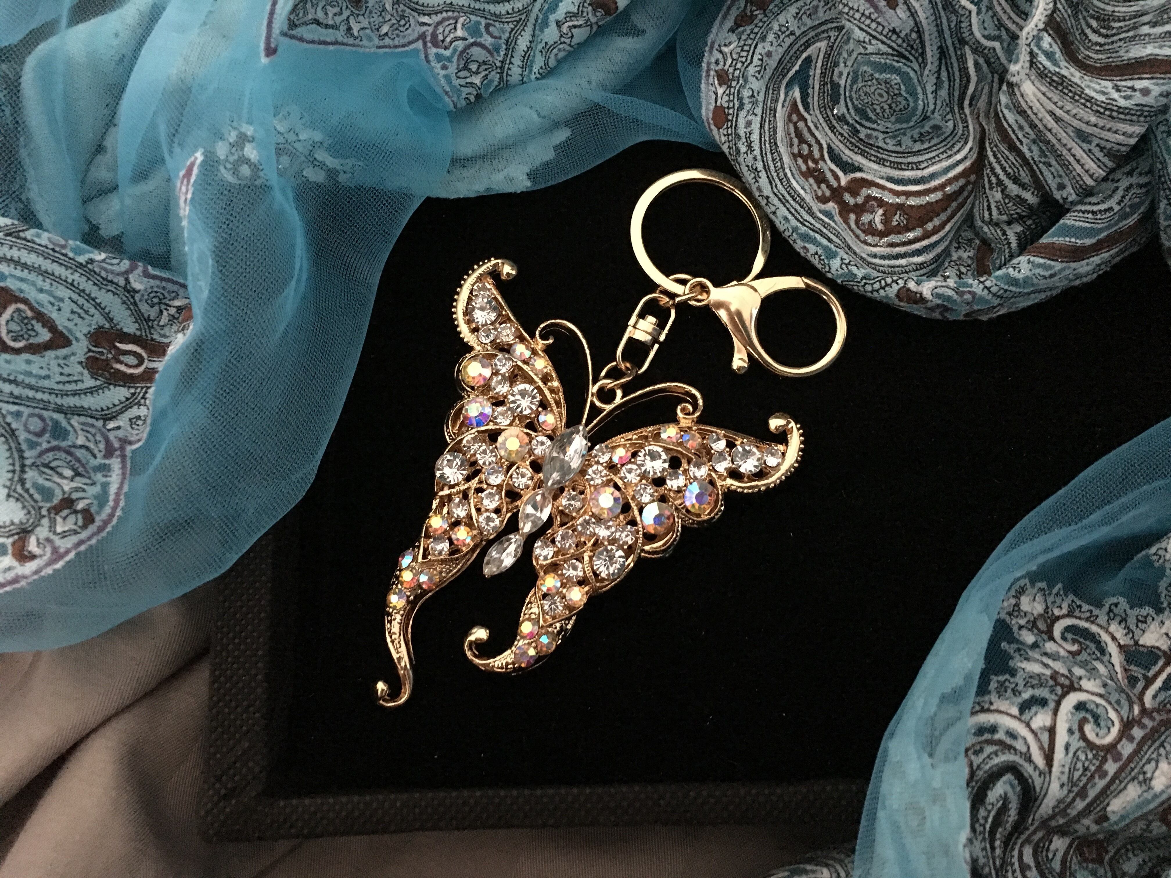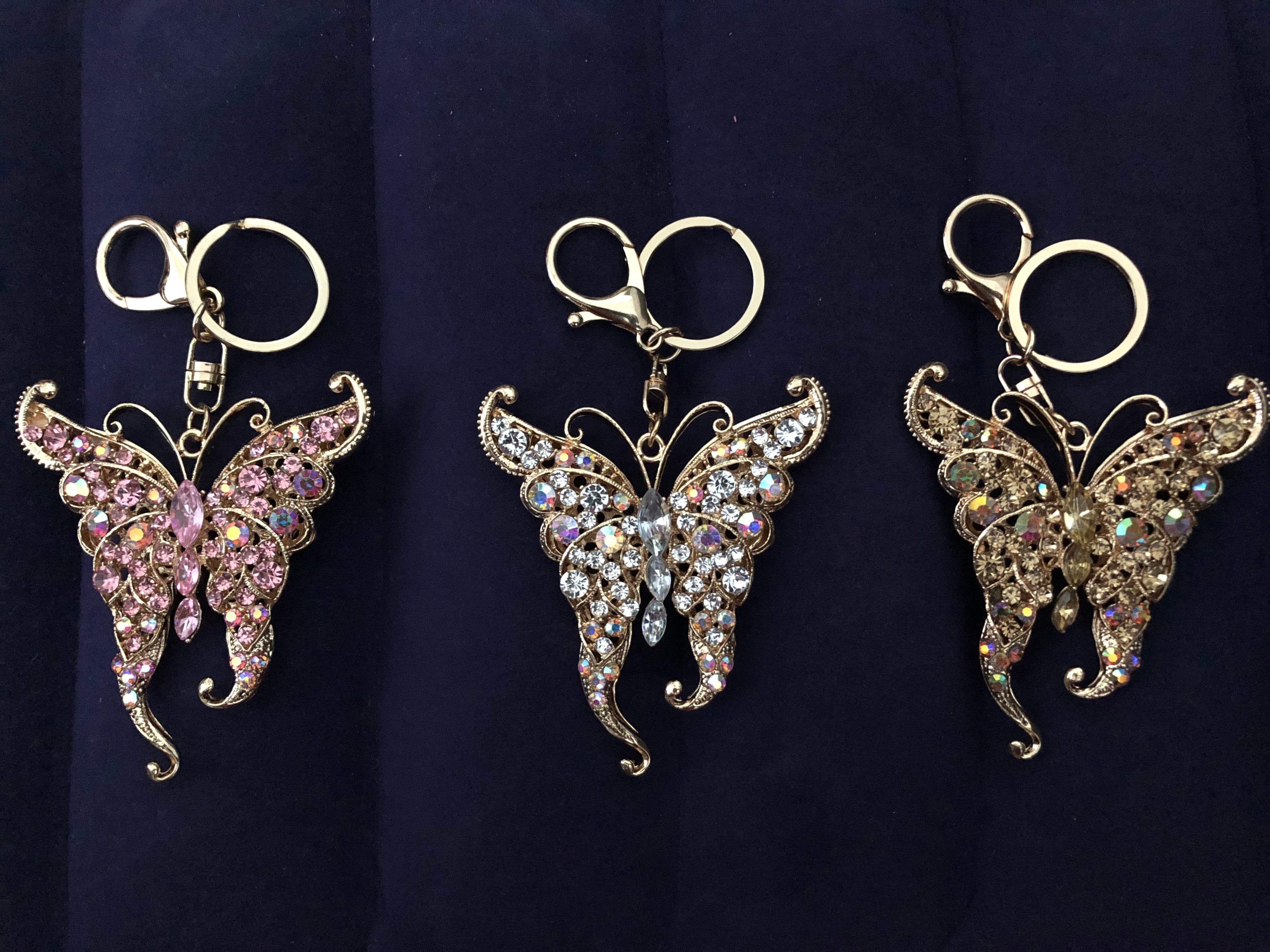 ぎっしり敷き詰められたビジューの蝶のバッグチャームキーホルダー インパクトのある大きいサイズと付属のタッセルが可愛いキーホルダー。キーホルダーとしてもチャームとしてもOK