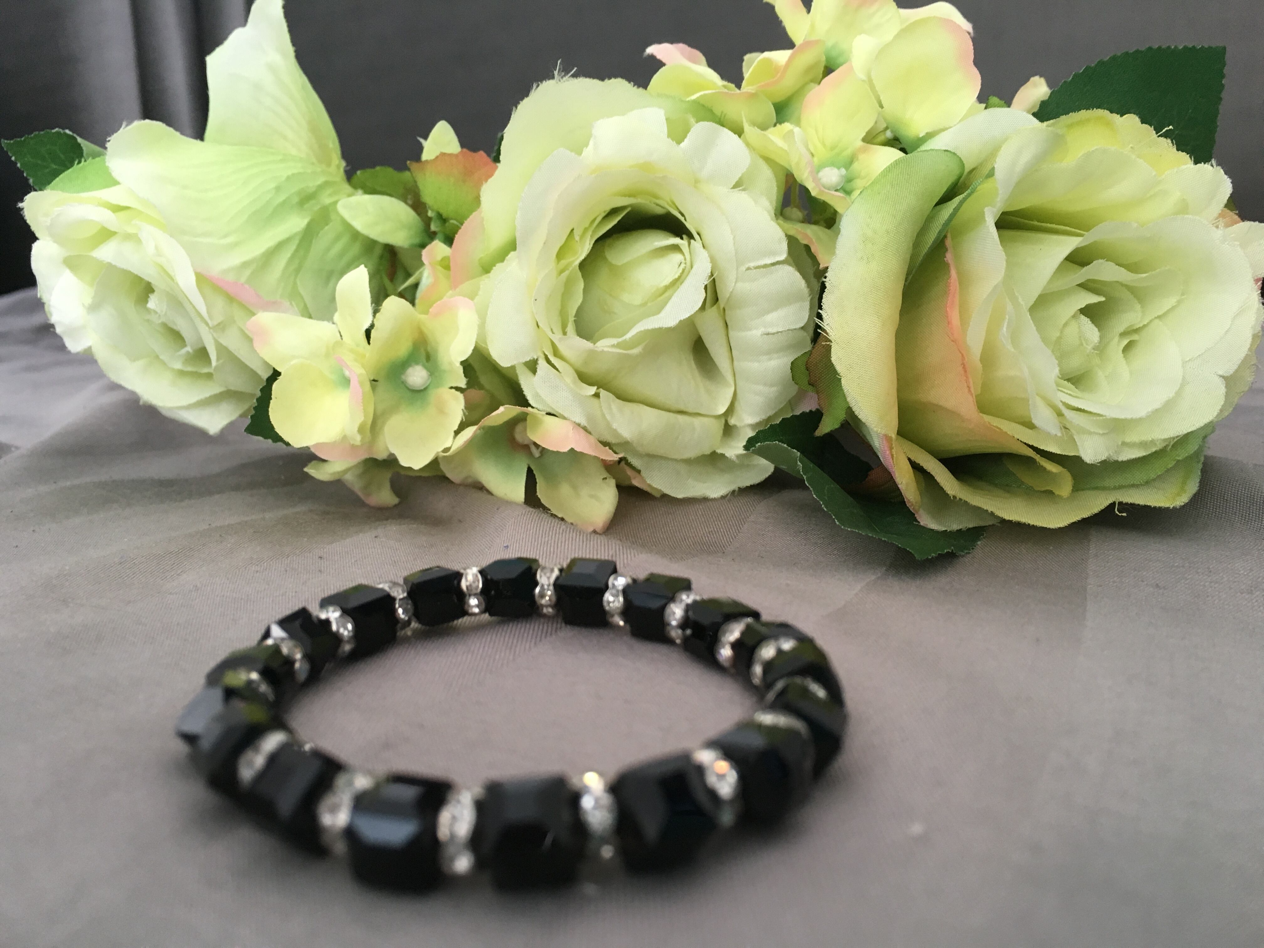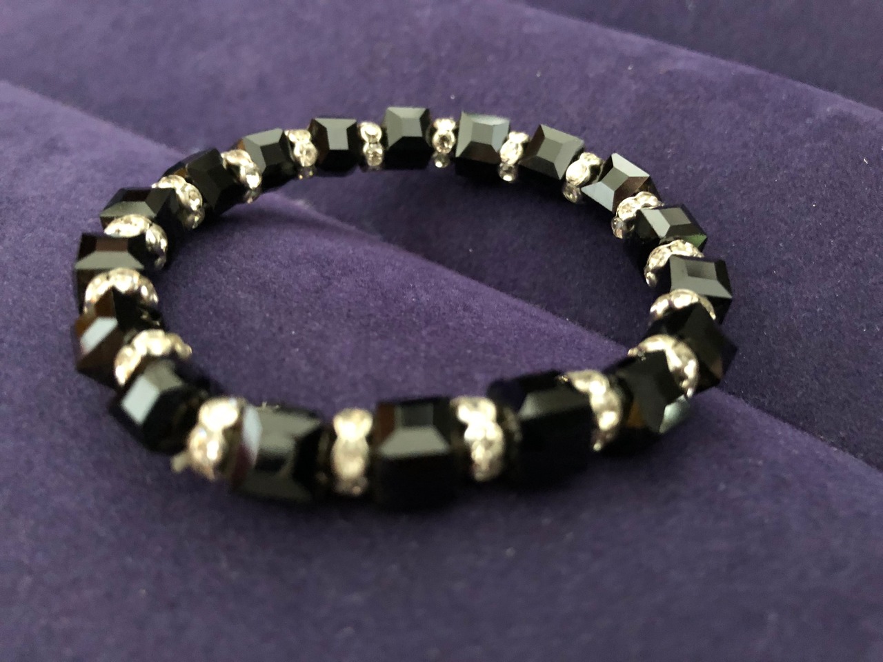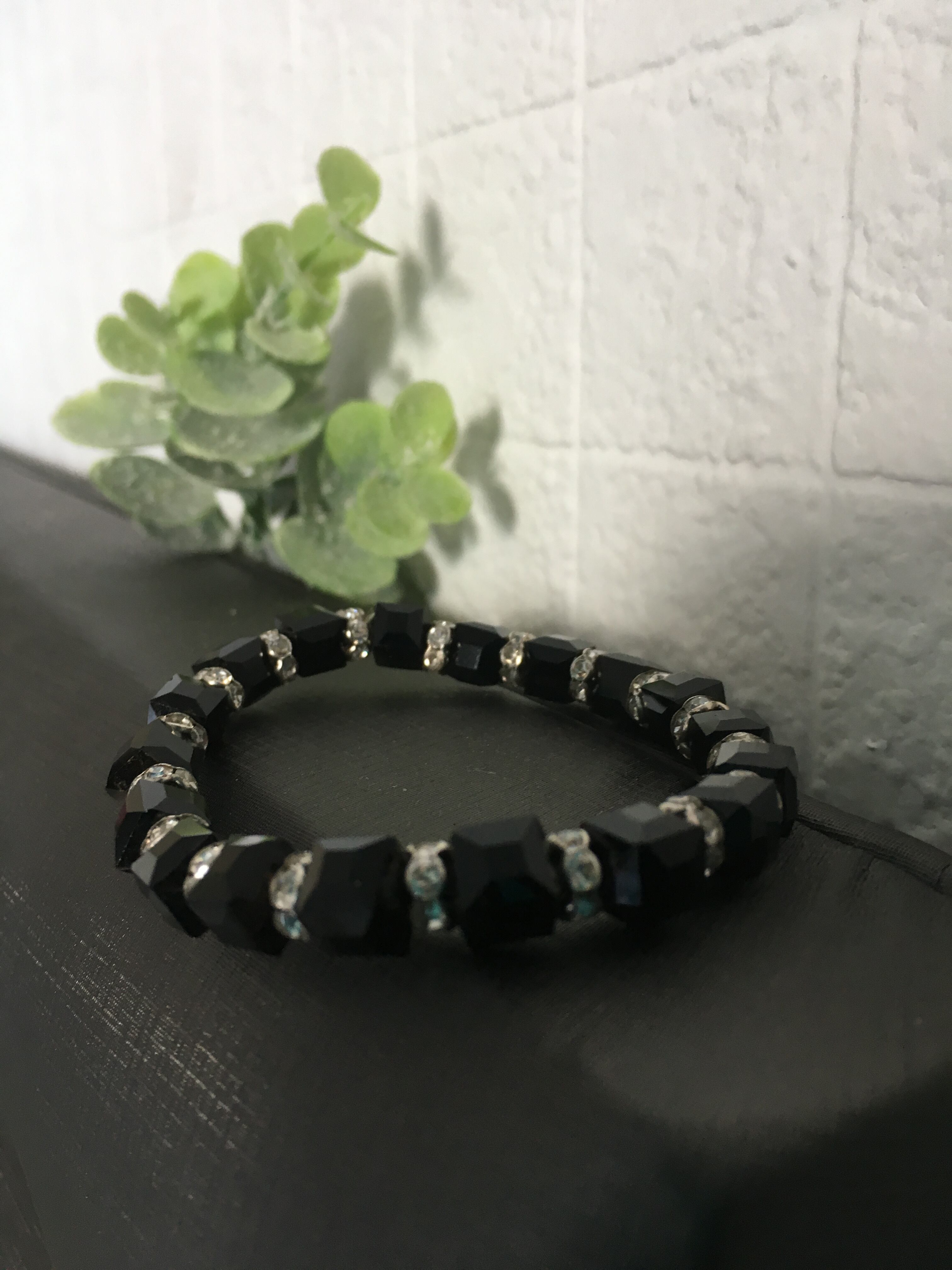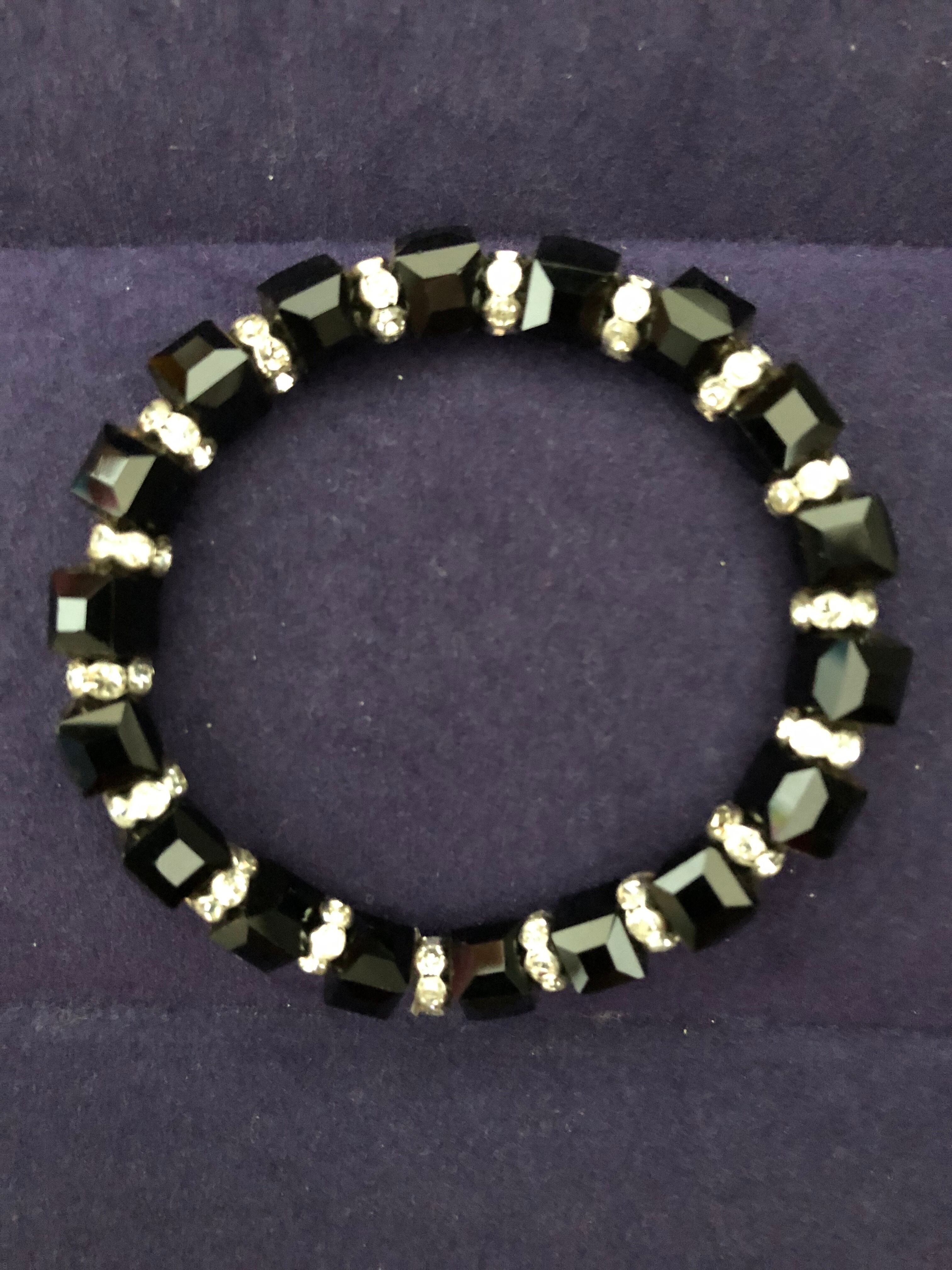 【商品説明】 : キラキラのラインストーンが埋め込まれたブラックライトストーンのブレスレットです。プチゴージャスなかっこいいデザインです。季節を問わず使えると思います。